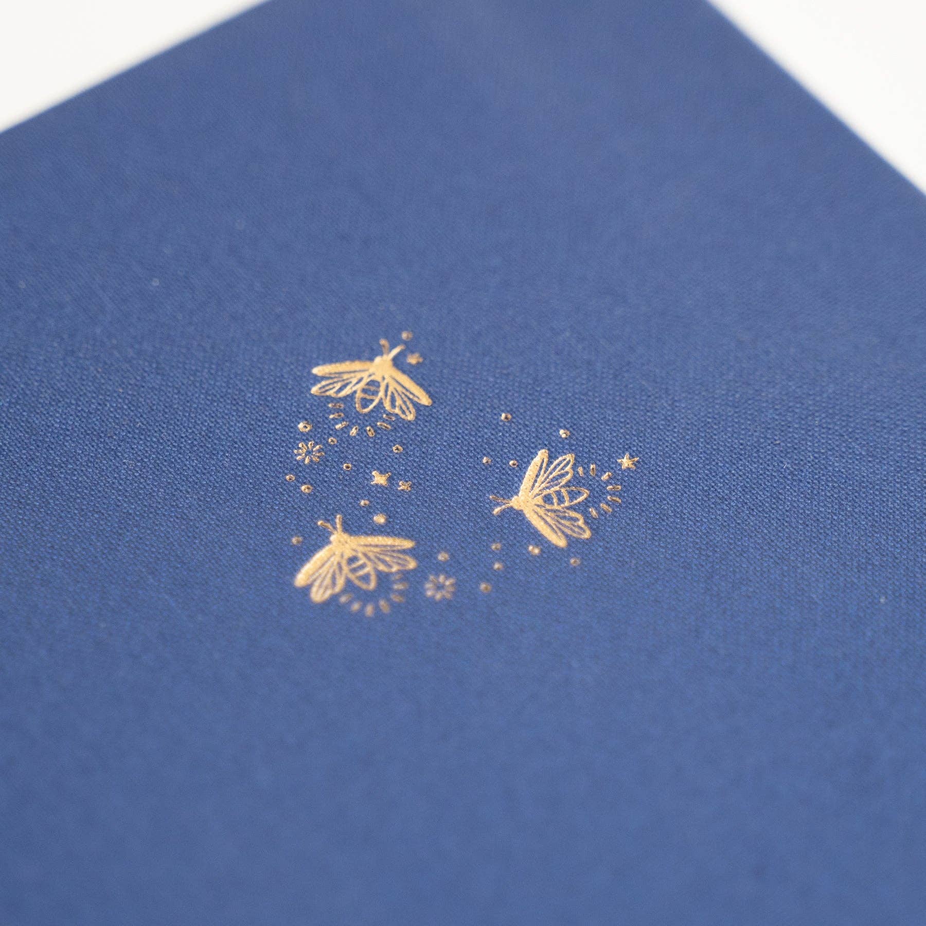 Witness the magic of nature’s fairy lights with our Firefly Night notebook. This notebook features a glowing firefly design, stamped with gold foil on a vibrant blue buckram cover.