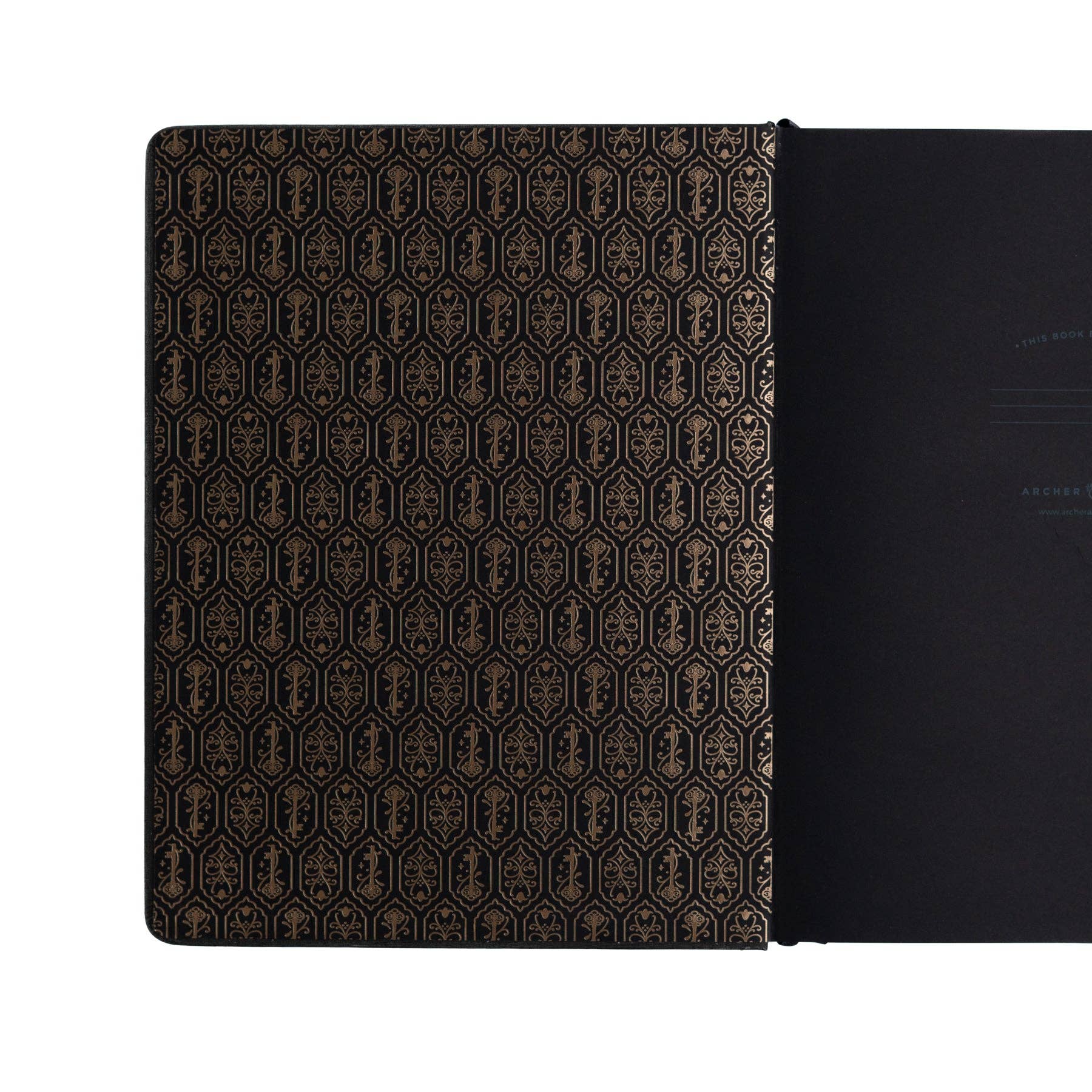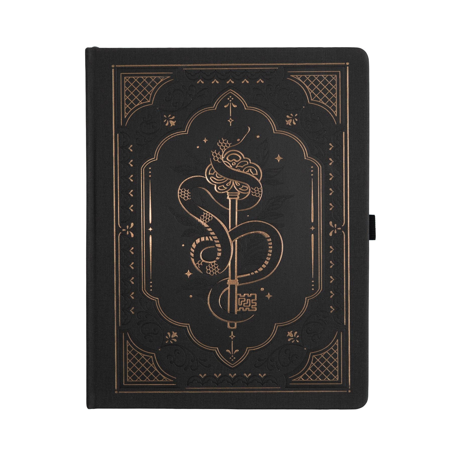 Unlock your creativity with the LS Coiled Key Notebook. Designed with a metallic foil serpent-and-key motif on a sleek black vegan leather cover, this oversized notebook offers plenty of room for writing, sketching, and planning. Dramatic black dot grid pages to fit your journaling style.