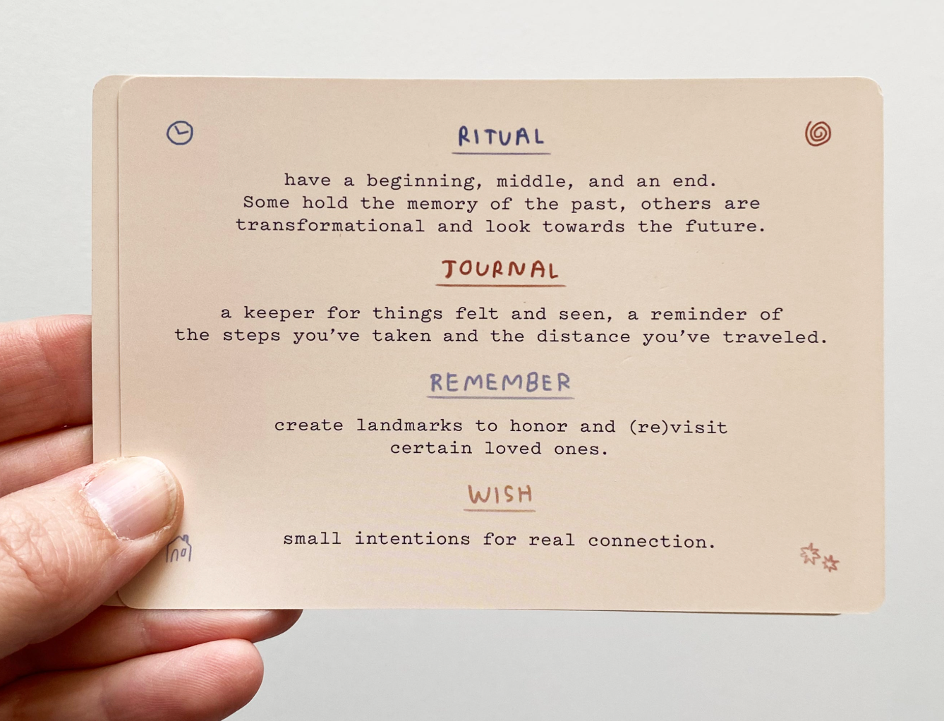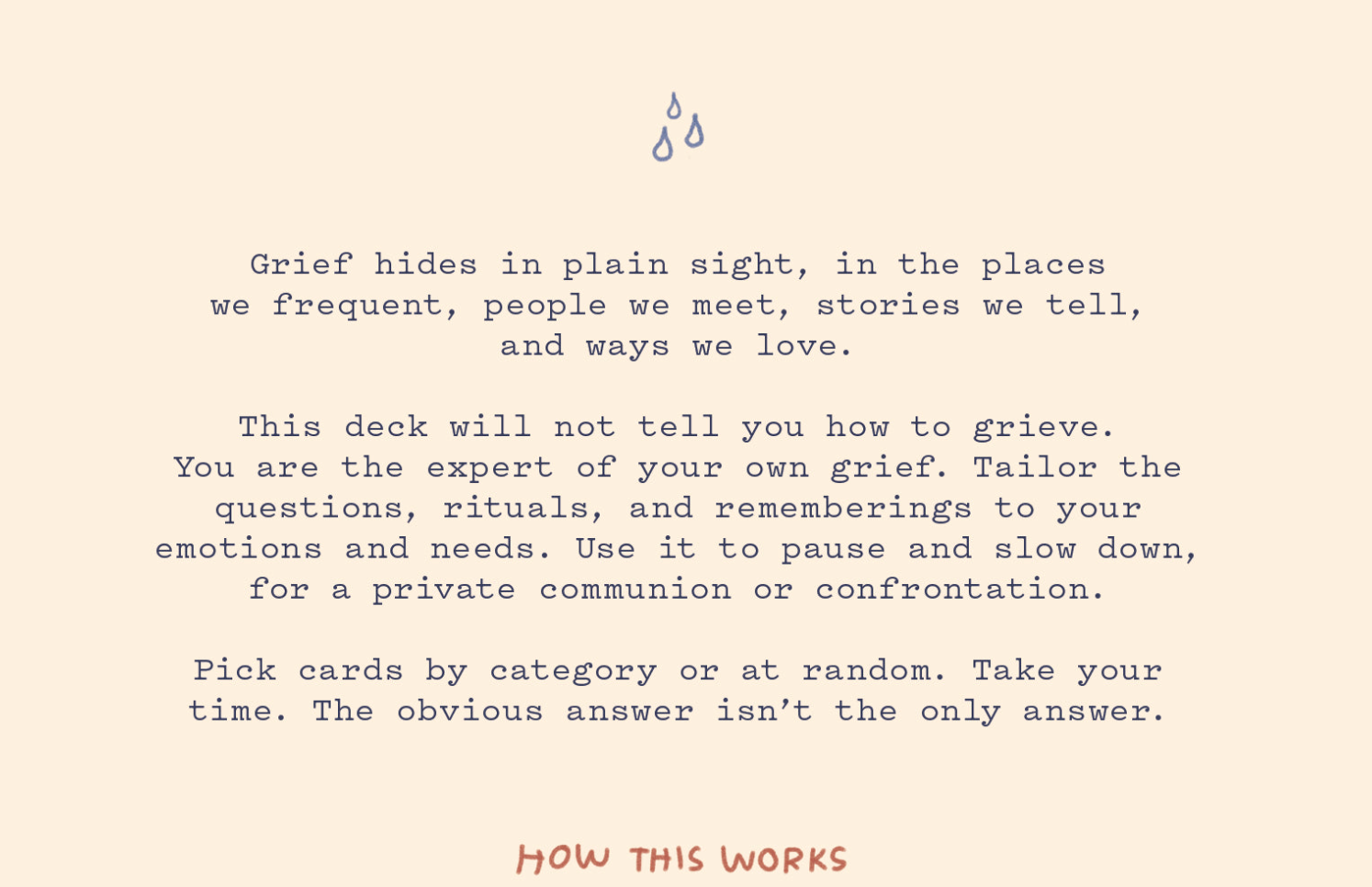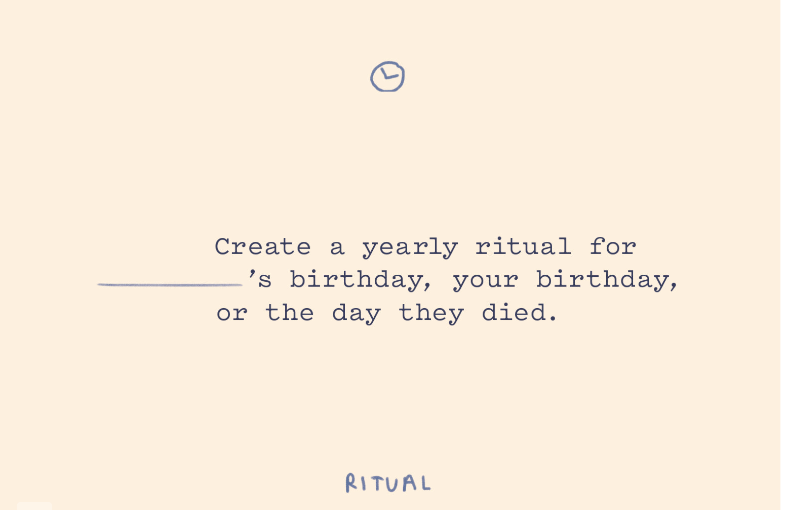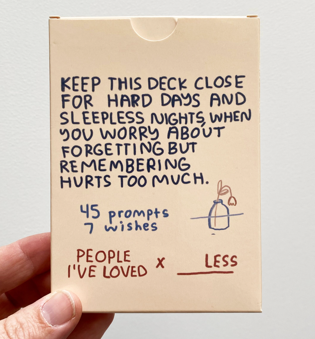 This deck will give you some tools for remembering, loving, and holding close someone who is no longer with you, and to grapple with all the messy feelings that a person's loss might stir.